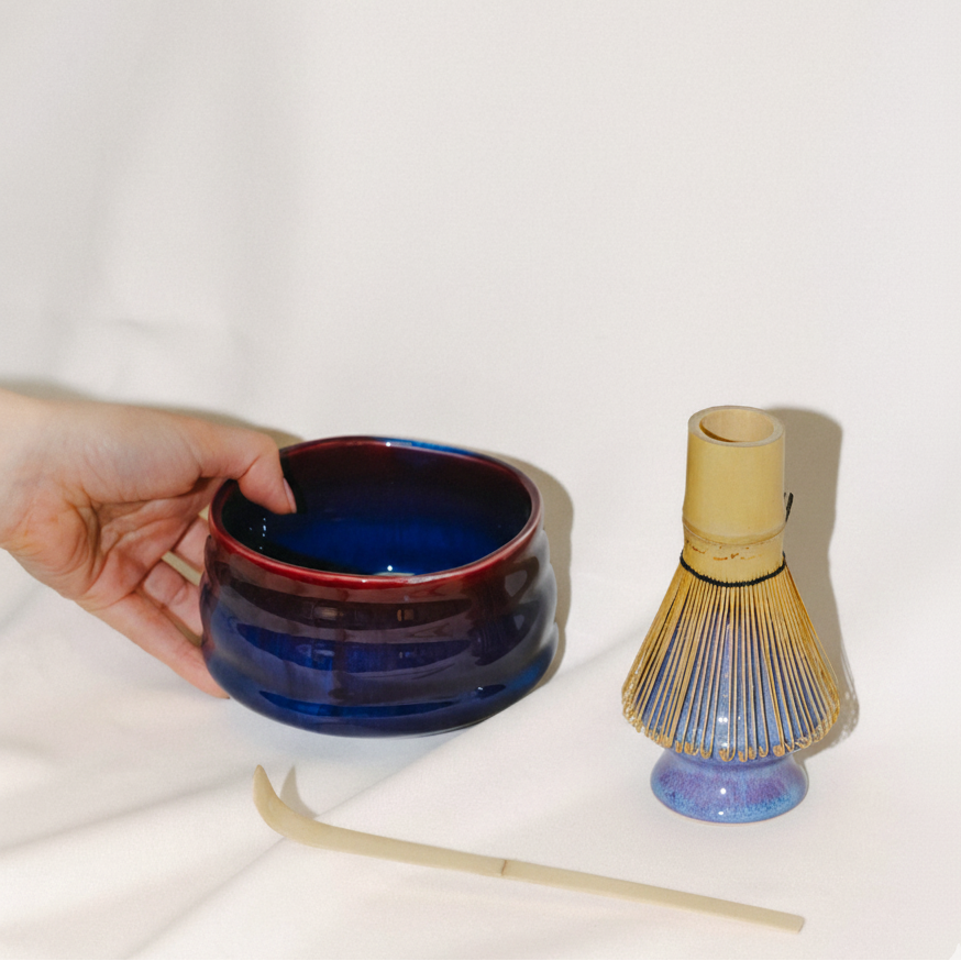 Chawan (茶碗) – Bol artesanal para batir y disfrutar tu matcha. Chasen (茶筅) – Batidor de bambú que crea la espuma perfecta, como nebulosas en el cosmos. No te olvides sumergirlo en un vaso con agua caliente antes de su uso, para que no se estropee con el tiempo. Chasen-naoshi (茶筅直し) – Soporte para mantener la forma del batidor y prolongar su vida útil. Chashaku (茶杓) – Cuchara de bambú para medir la dosis exacta de matcha.