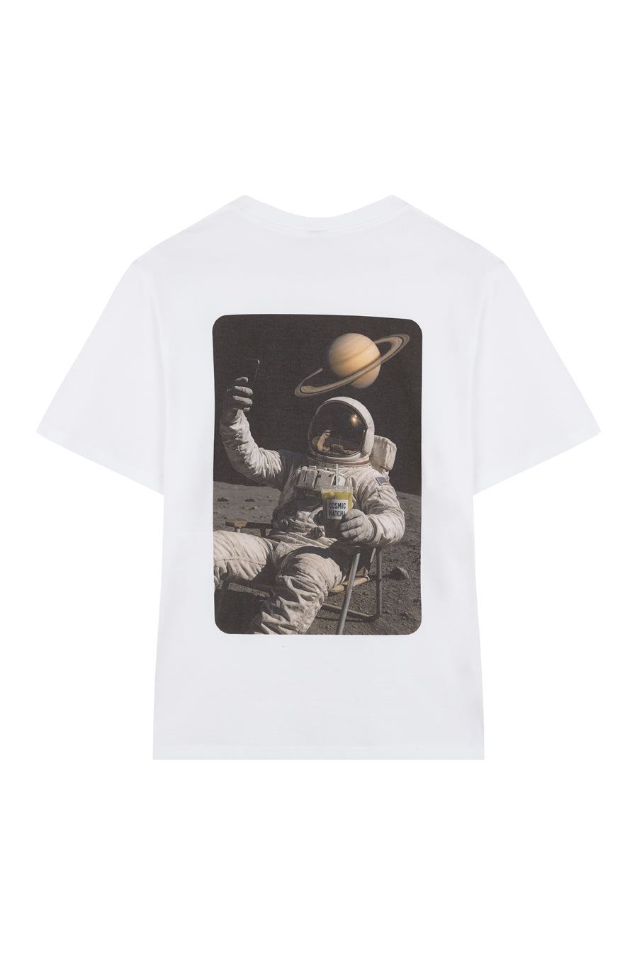 Nuestra camiseta está hecha de 100% algodón, es unisex, de corte relajado, con el logo Cosmic Matcha en el pecho y una ilustración exclusiva en la espalda: un astronauta haciéndose un selfie mientras se bebe un matcha en la Luna.